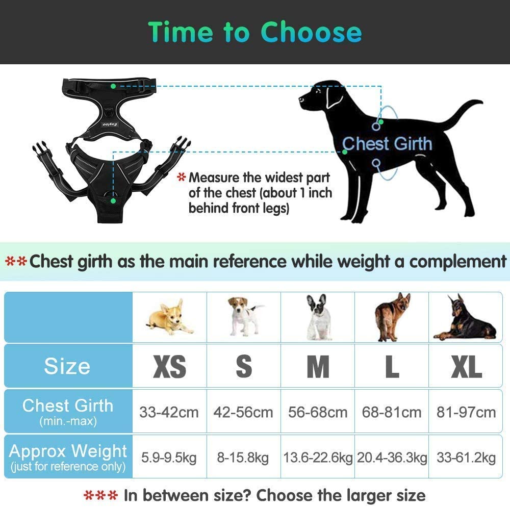 - 5 puntos de ajuste: el arnés para perro sin tirones tiene 5 puntos de ajuste convenientes para una gama completa de movimiento. Todas las correas son ajustables, fáciles de poner y quitar. Mide y consulta nuestra tabla de tallas para encontrar el mejor ajuste antes de realizar el pedido.