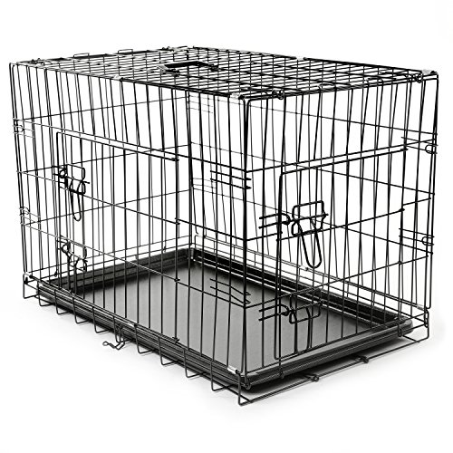 Jaula para perros (76cm) – Jaula plegable de metal negro con 2 puertas (frontal y lateral) con bandeja base de plástico resistente a la masticación y asa de transporte (mediano)