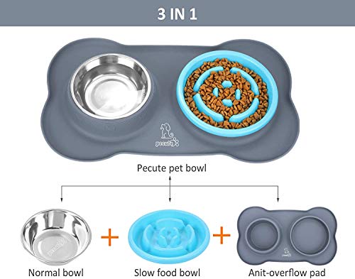 - ? 【3-en-1】Comprar el bol para mascotas Pecute equivale a adquirir 1 alfombrilla anti-derrames + 1 bol de alimentación lenta + 1 bol para mascotas! La alfombrilla de silicona anti-derrame tiene un borde levantado que previene efectivamente que la comida y el agua se desborden y ensucie el suelo! Diseño de doble bol: un lado es un bol de alimentación lenta para la comida de las mascotas, y el otro lado es un bol de acero inoxidable para el agua.
