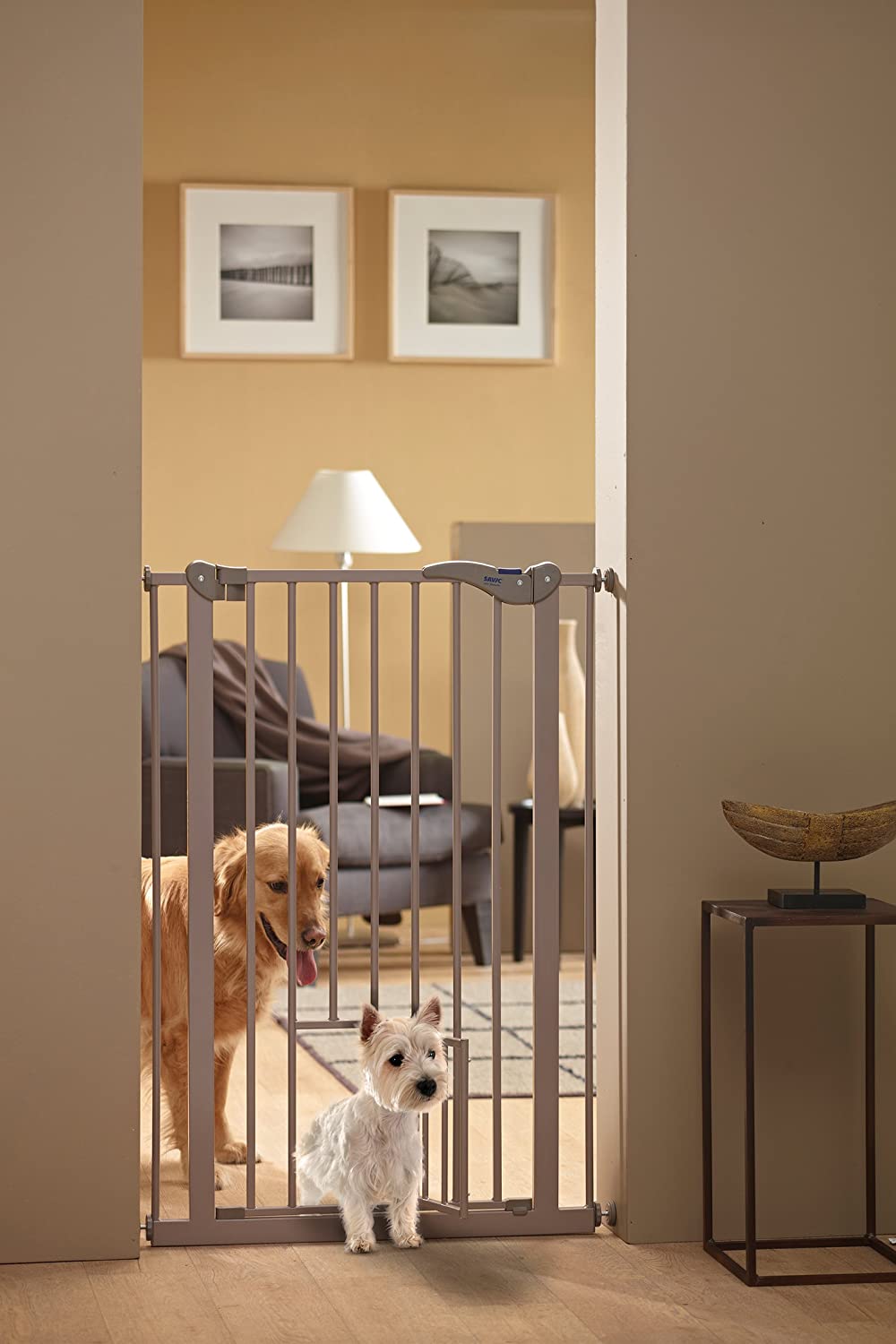 Bettacare Puerta de Puerta con Cerradura para Gato con Solapa de presión, 75 cm - 148,7 cm, Puerta para Escalera y Puerta para Mascotas (75 cm - 84 cm, Gris Pizarra)