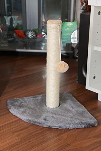 - Fácil de instalar en una cubierta – tablero de MDF cubierto con tela y poste de sisal. Cada poste de gato cuenta con una base cubierta de tela que puede caber fácilmente en una esquina y un poste de 36 cm de alto cubierto de sisal que tiene una bola de juego de 5,5 cm. Diámetro de la base: 27 cm aprox.