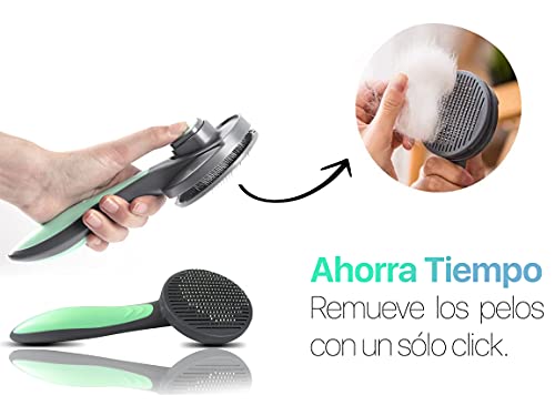 - ?【UN-CLIC BOTÓN】: Con el cepillo autolimpiante para perros puede quitar el pelo del cepillo fácilmente después de cepillar a sus mascotas. Simplemente haga un clic en el botón, las cerdas se retraen de nuevo en el cepillo, a continuación, todo el pelo se retira del cepillo y éste estará como nuevo. Ahorre tiempo y esfuerzo con este cepillo para perros.