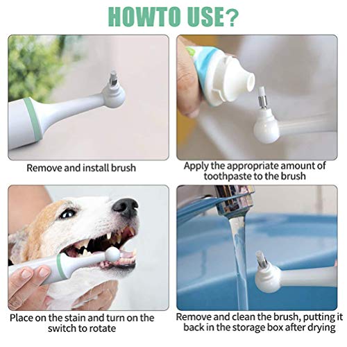 - EFECTO DE LIMPIEZA MARAVILLOSO: con una vibración alta y frecuente, 1200/min, el cabezal del cepillo gira 360 grados para pulir la superficie del diente de la mascota, la fuerte capacidad de descontaminación penetra en el lugar que el cepillo de dientes ordinario no puede alcanzar y no dañará las encías