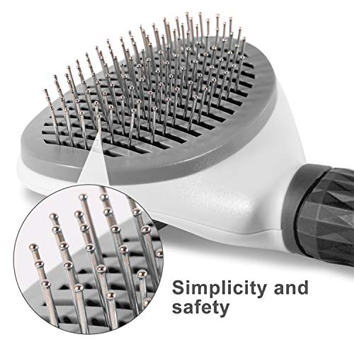 - Fácil de limpiar: cuando hayas terminado con el cepillo de tu mascota, solo tienes que hacer clic en el botón y las cerdas se deslizan hacia atrás en el cepillo para que puedas quitar fácilmente todo el pelo del cepillo.