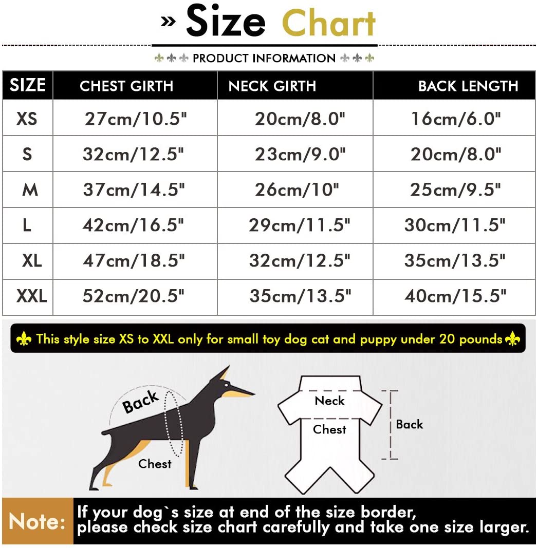 - Aviso: Por favor no elijas el tamaño de acuerdo a tu talla habitual. Mide el contorno del cuello, del pecho y la longitud de la espalda de tu mascota, y elije el tamaño correcto de acuerdo a nuestra información de tallas en la descripción. Si tu mascota está creciendo, por favor elije una talla más grande.
