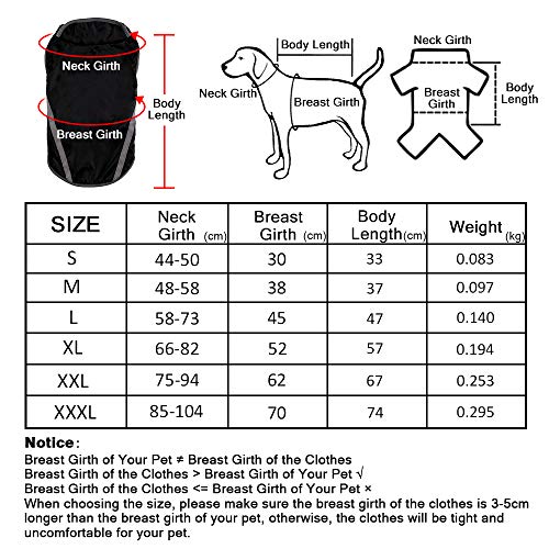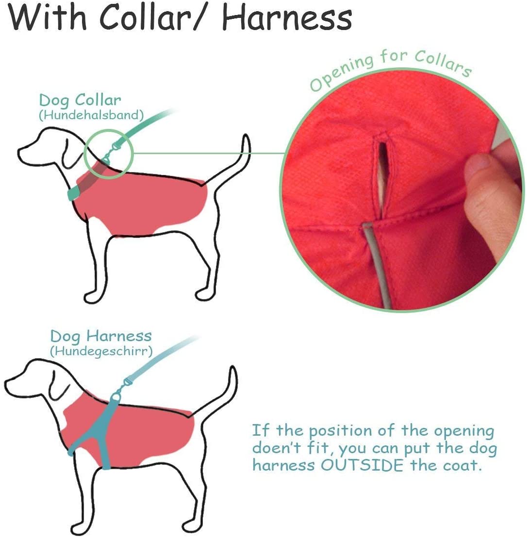 - ★ Seguridad y Conveniencia:Las tiras reflectantes mantienen a su perro se puede ver en la oscuridad y puede poner la correa a través del agujero abierto en el cuello, así controlará su perro cuando lo pasa. A sua perros le gustan caminar incluso en días lluviosos. Por lo tanto, necesita un impermeable para evitar enfermedades de la piel o el frío.