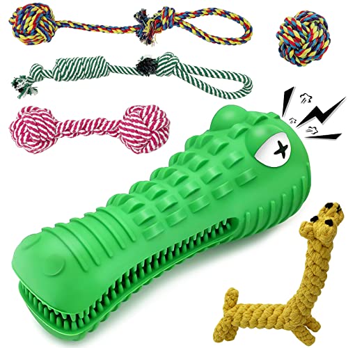 - 【COMBINACIÓN CREATIVA COMPRADA】: Este juego de juguetes para masticar para perro contiene un cepillo de dientes SQUEAKY con forma de cocodrilo y cinco juguetes de cuerda, ambos entretenidos y funcionales, que son juguetes para mascotas imprescindibles en casa.