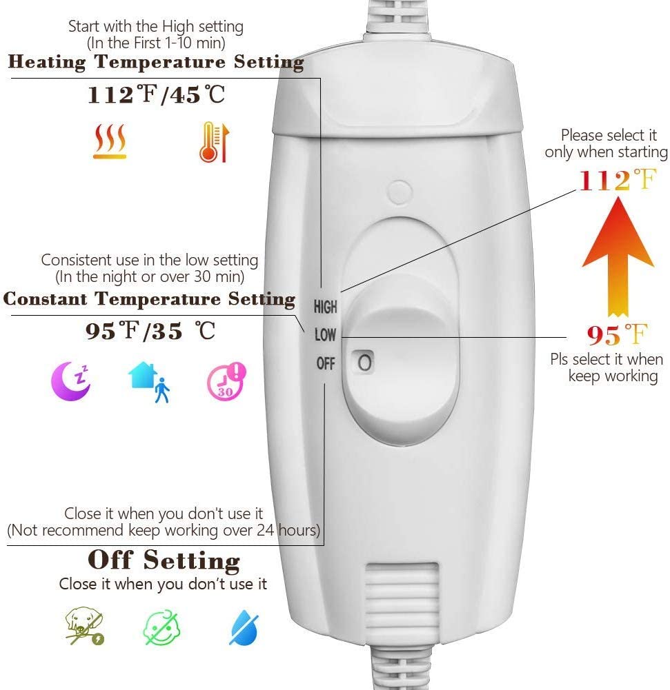 - ❤【Almohadilla Térmica de Control de Temperatura Ajustable】Alto o bajo nivel de control de temperatura. La configuración baja se puede calentar a aproximadamente 92 grados Fahrenheit y la configuración más alta puede ser de hasta 110 grados Fahrenheit. (Se recomienda que pueda usar la temperatura alta para elevar rápidamente la temperatura a la temperatura ideal, y luego transferirla a la temperatura baja para mantener una temperatura constante).