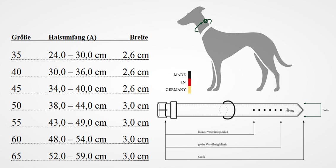 - Talla 35: circunferencia del cuello 24 – 30 cm, ancho de 2,6 cm.