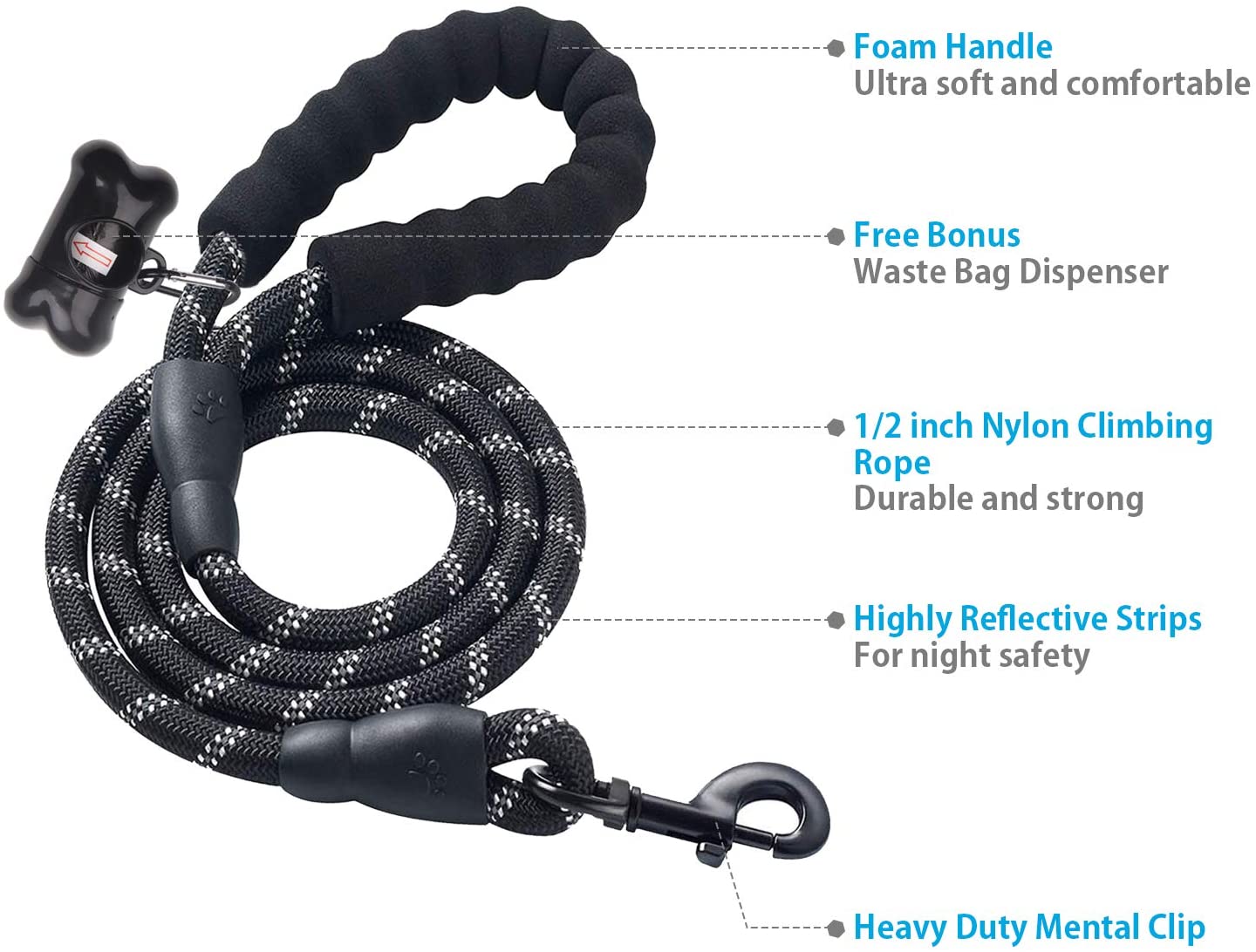 - Longitud de 5 pies: equilibrio perfecto entre libertad y control, mantenga a su perro libre y bajo su control. El soporte y las bolsas de desechos para perros gratis le ayudan a limpiar la caca del perro de manera conveniente.