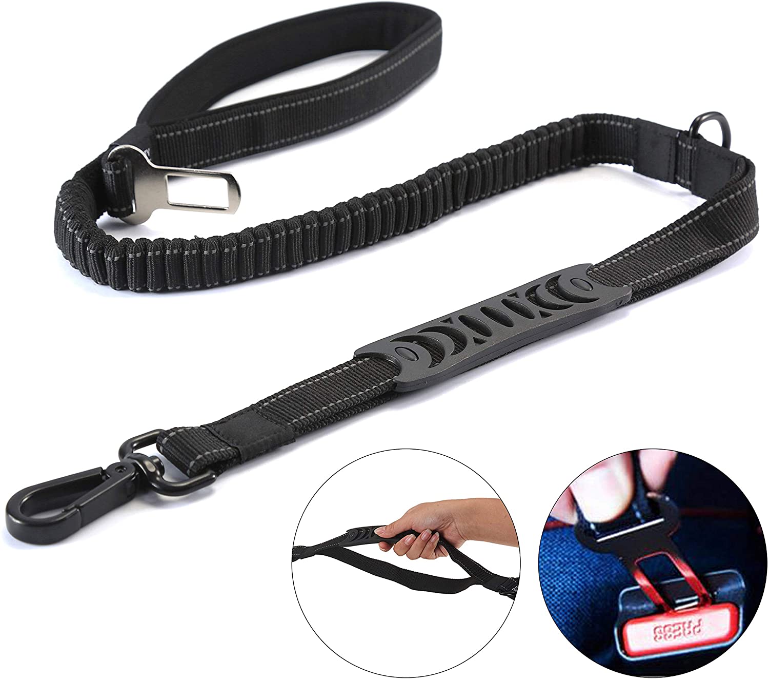 HAPPY HACHI Correas de Adiestramiento para Perros Nylon Correa Reflectantes Elástica para Perros Medianos Grandes con 2 Manijas Blandas Cinturón de Seguridad para Perros (Longitud 110-150 cm, Negro)