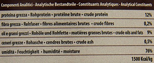 - Composición: 88,5 % de carne y vísceras, 5 % de mijo cocido, 5 % de zanahorias, 1 % de minerales, 0,5 % de aceite de cártamo