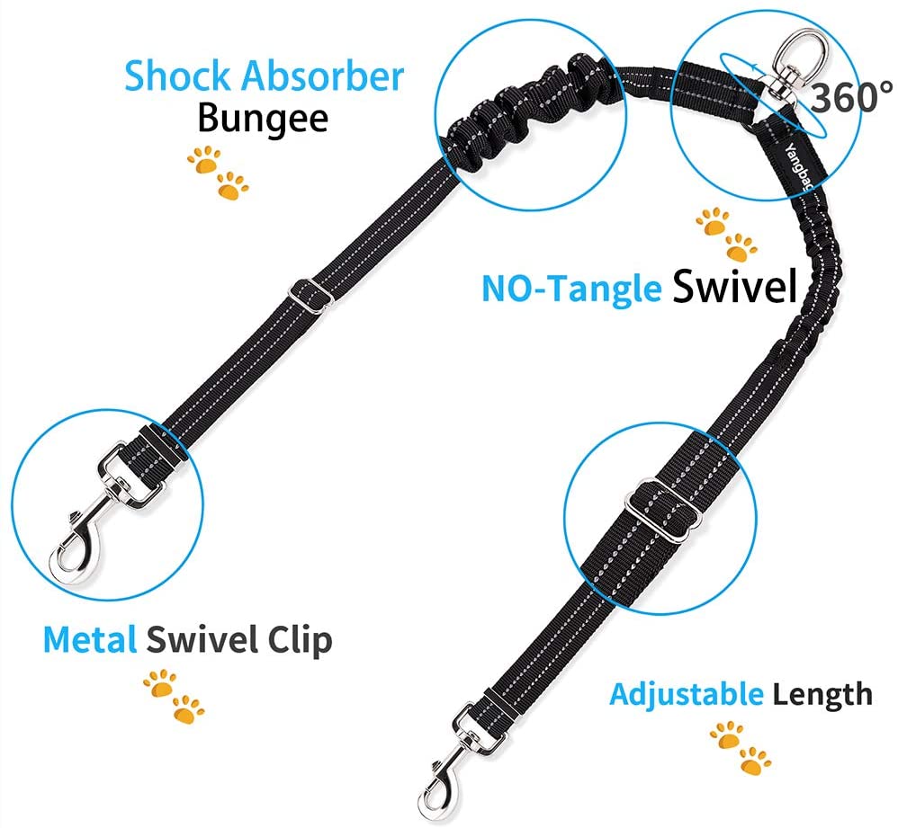 - Ajustable y cómodo: el accesorio de correa giratoria sin enredos evita que su perro se entrelace, lo que permite que dos perros se muevan libremente. Los amortiguadores amortiguadores son para aumentar la amortiguación y distraer la potencia en caso de movimiento repentino. Buena longitud ajustable para que los perros puedan ponerse cómodos sin restringirse.