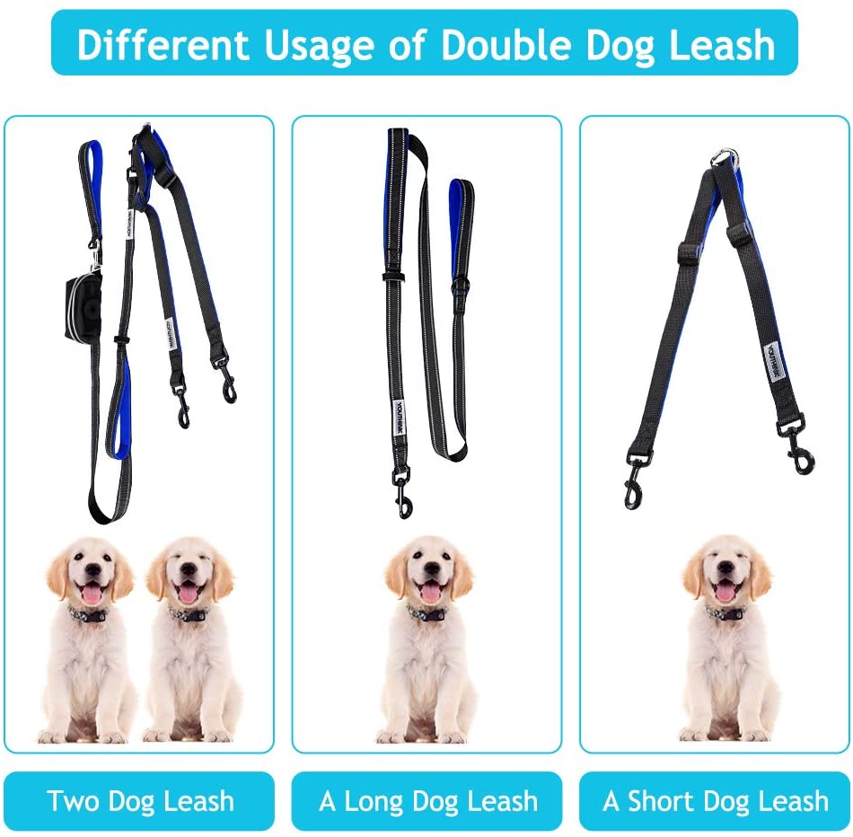 - ✔【Modo de 1 Perro & Bolsa de Cintura】: ¿Solo necesitas pasear 1 perro? Quítese el acoplador, se convierte en un correa normal. Viene con una bolsa de cintura desmontable para almacenar llaves, dinero o comida para perros (BONUS bolsas de basura)