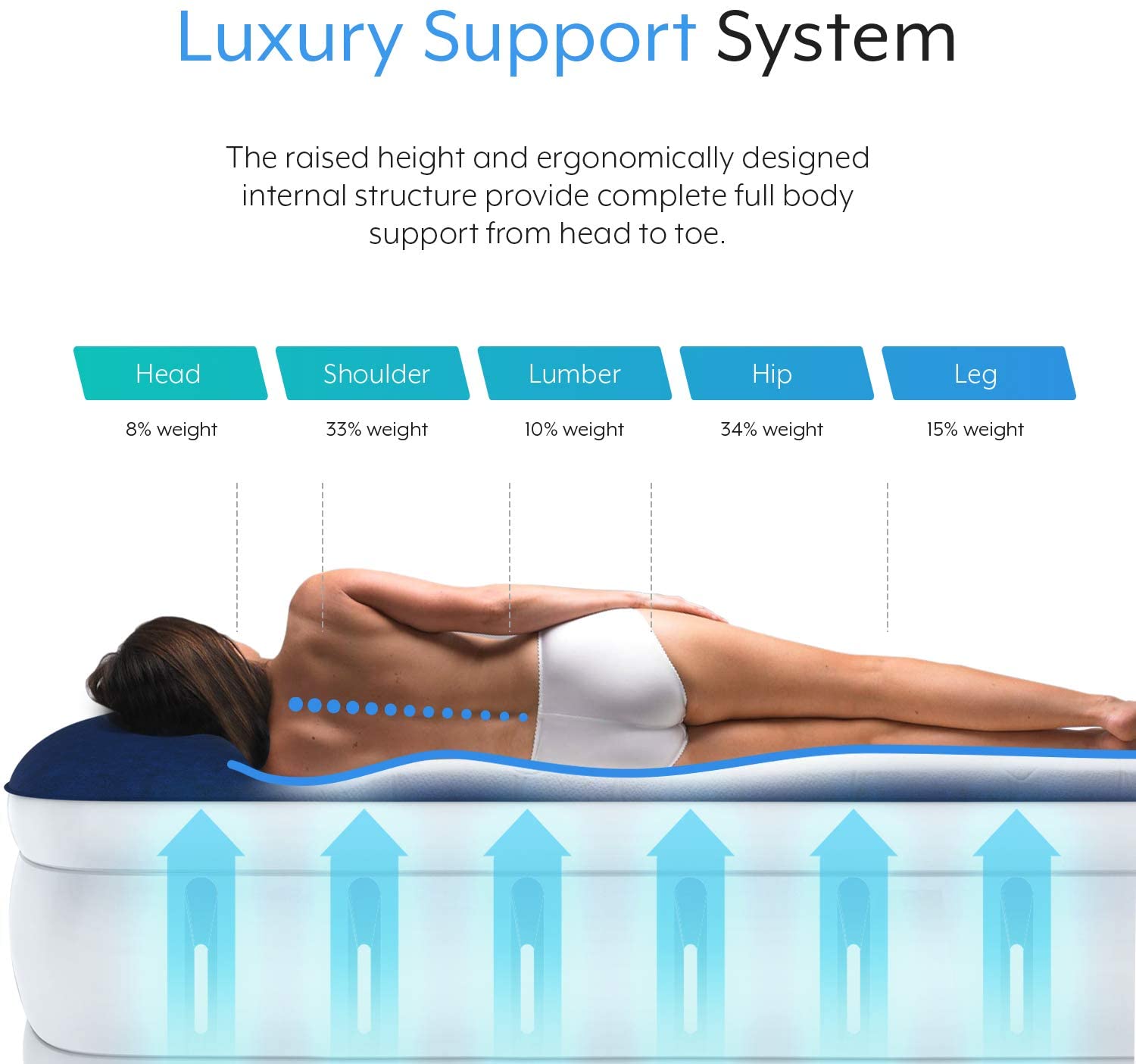 - SOPORTE DE CUERPO COMPLETO: esta cama hinchable está equipada con 21 bobinas de aire estructuradas para proporcionar el máximo soporte para su cuerpo, cuello y columna vertebral