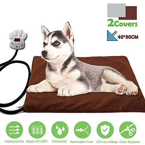 OMORC Manta Eléctrica para Perro Interior, 2 COVERS, Almohadilla Térmica para Mascotas con Termostato, 12V Baja Tensión, 3 Temperatura y Temporizador Ajustable, Cojín de Calefacción Perro Anti-Mordida