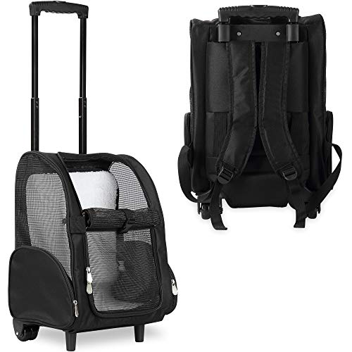 Mochila de viaje, bolsa de transporte con ruedas para perro, gato, maleta con ruedas para mascotas, asa telescópica, para viaje, camping, senderismo en tren, coche o avión (negro)