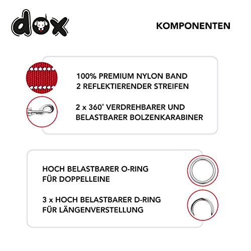 DDOXX Correa Perro Multiposición Nylon Reflectante, Ajustable en 3 tamaños, 2 m | Muchos Colores & Tamaños | para Perros Pequeño, Mediano y Grande | Correa Doble 2 Gato Cachorro | XS, Rojo, 2m