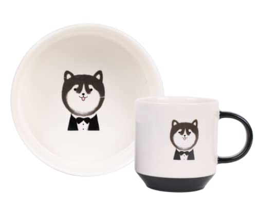BIOINLIVING Juego de tazas para mascotas con caja de regalo, taza de cerámica de café con asa, cuenco de cerámica para perros y alimentos y agua, plato de cerámica para perros de tamaño mediano, Husky