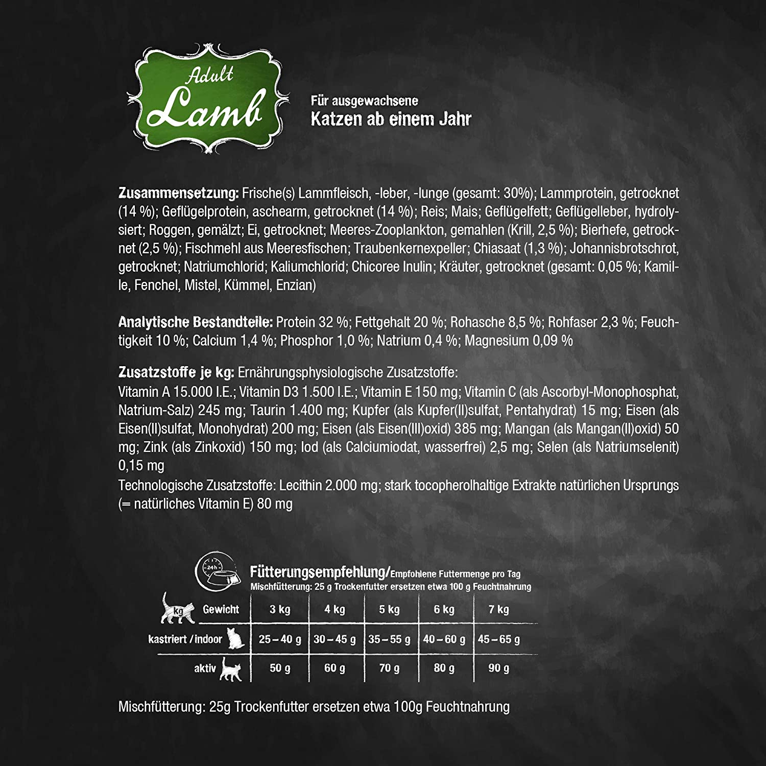 - Carne de cordero, – Corazón, – Hígado, – pulmón, – riñón, – pansen (73%); caldo de carne de cordero (27%)