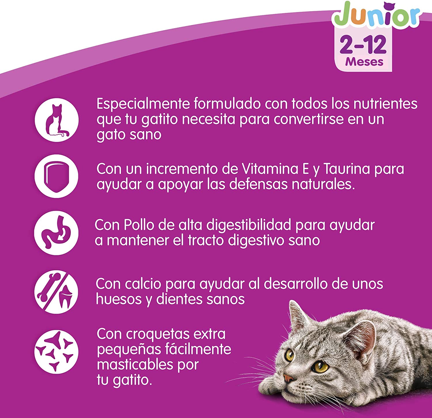 - Alimento completo y equilibrado recomendado para gatitos de 2 a 12 meses.