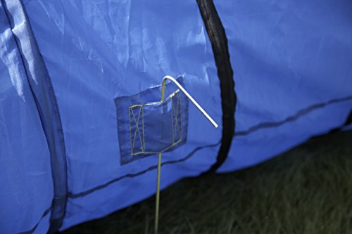 - Material duradero: forrado con una cubierta azul hecha de tejido Oxford Dacron ligero pero sorprendentemente duradero. Incluido en este set 12 estacas de 6,3 pulgadas chapadas en zinc antioxidantes que se insertan a través de las pestañas de metal alrededor de la base del túnel. La parte superior en ángulo hacia abajo de las estacas no sobresaldrá del suelo y causará daño a tus perros mientras juegan.