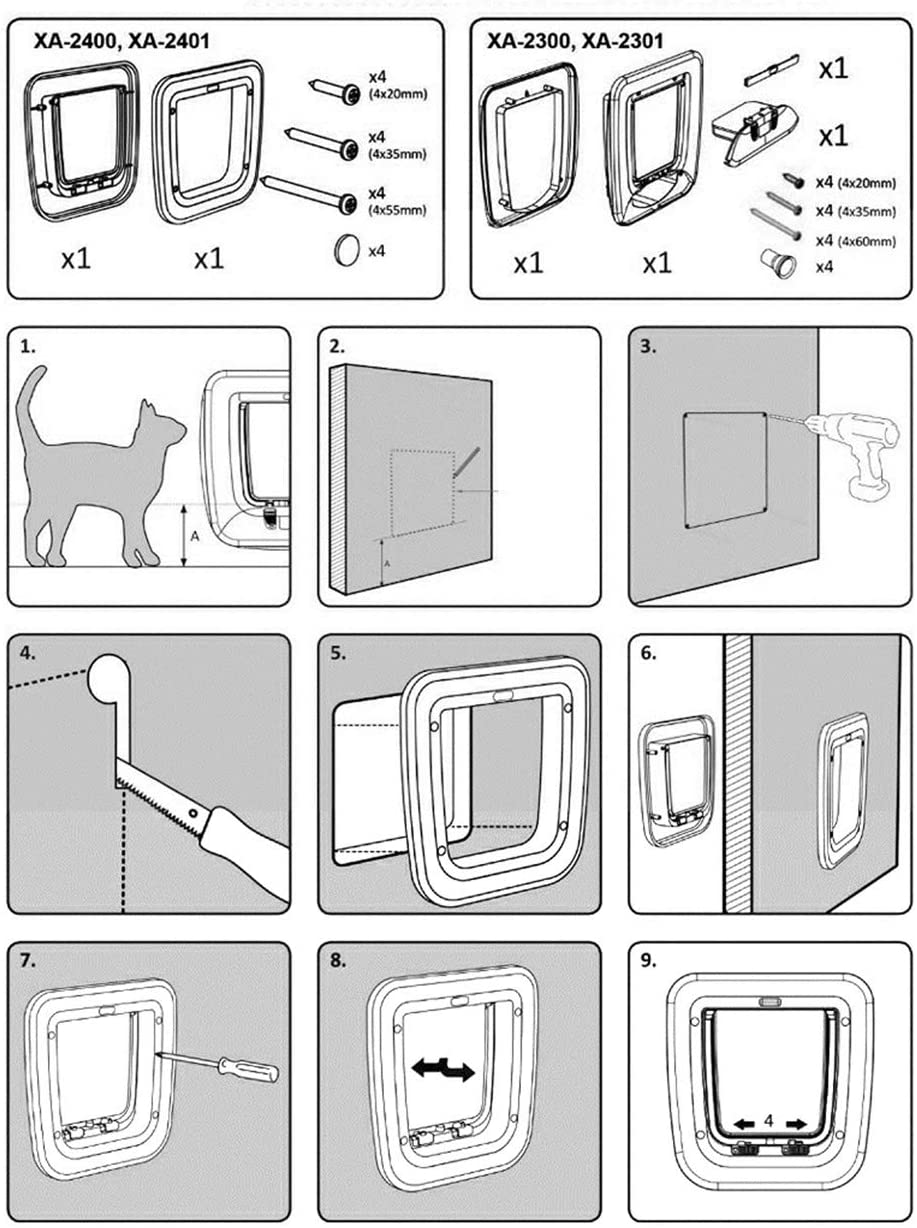 - ✅ Apta para todo tipo de puertas: ¿No está seguro de si puede instalarla en casa? Nuestra gatera puede ser instalada en cualquier tipo de material, pared, puerta de madera, pvc, aluminio, puerta de garaje o incluso puerta-ventana. Además, se suministran tornillos para las puertas de madera y pvc. Por favor, recurra a un instalador profesional para instalarla sobre cristal.