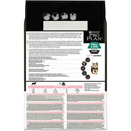 - Alimento completo para cachorros de razas pequeñas y miniatura con piel sensible. También es adecuado para perras en gestación / lactancia