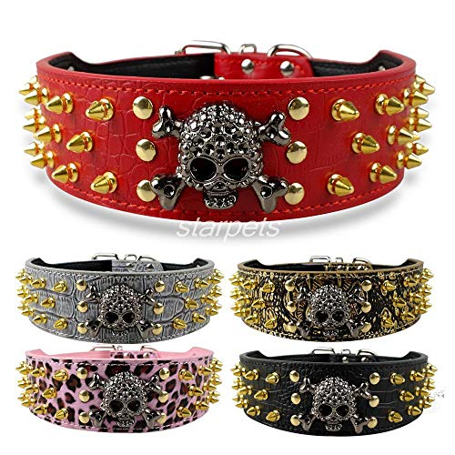 ZYYC 2 Width Gold Skull Spiked Studded Leather Dog Collars For Medium Large 15-24-Red_XL