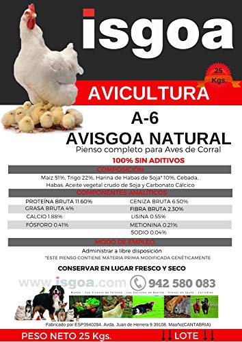 - Pienso ecológico para gallinas ponedoras para conseguir una alimentación sana, natural, completa y equilibrada para que su gallina esté saludable y produzca huevos de primera calidad. Su 17,5% de proteína mantiene una alta tasa de puesta. Peso neto: 25 Kg PIENSO COMPUESTO COMPLETO. MODO DE EMPLEO: Administrar Ad Libitum a gallinas ponedoras. COMPONENTESANALITICOS ProteinaBruta17,5% Fósforo0,61%