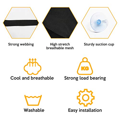 - Fácil de instalar y quitar: puede instalarlo sin esfuerzo utilizando las ventosas. Cuando está sucio, puede quitar fácilmente la hamaca para limpiarla.